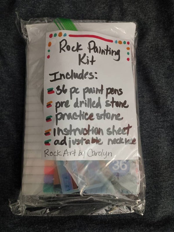 Make your own rock necklace! Included on n my kit is a pack of 36 paint pens, a drilled necklace stone, adjustable lanyard, and a practice rock. Instructions included